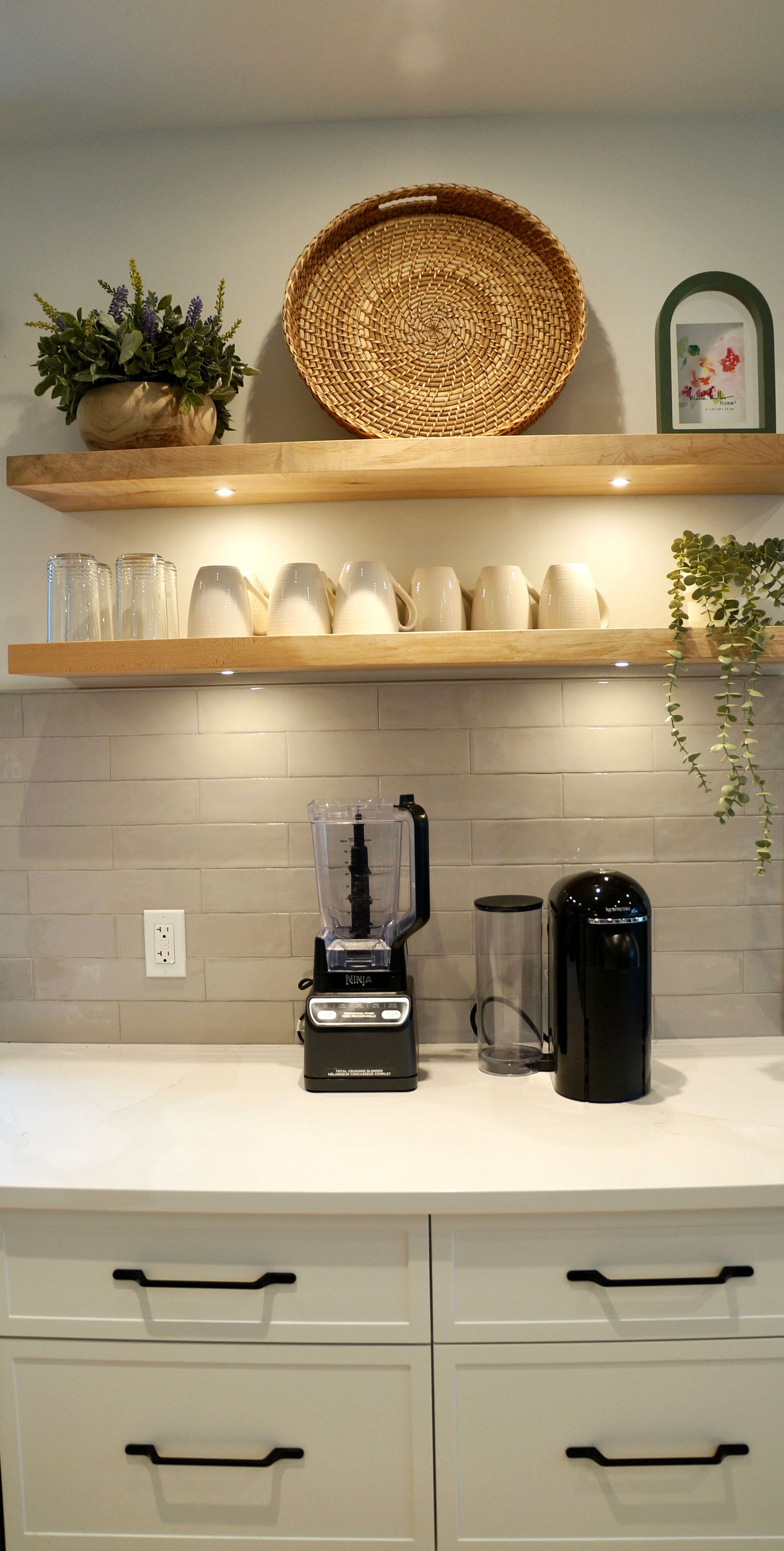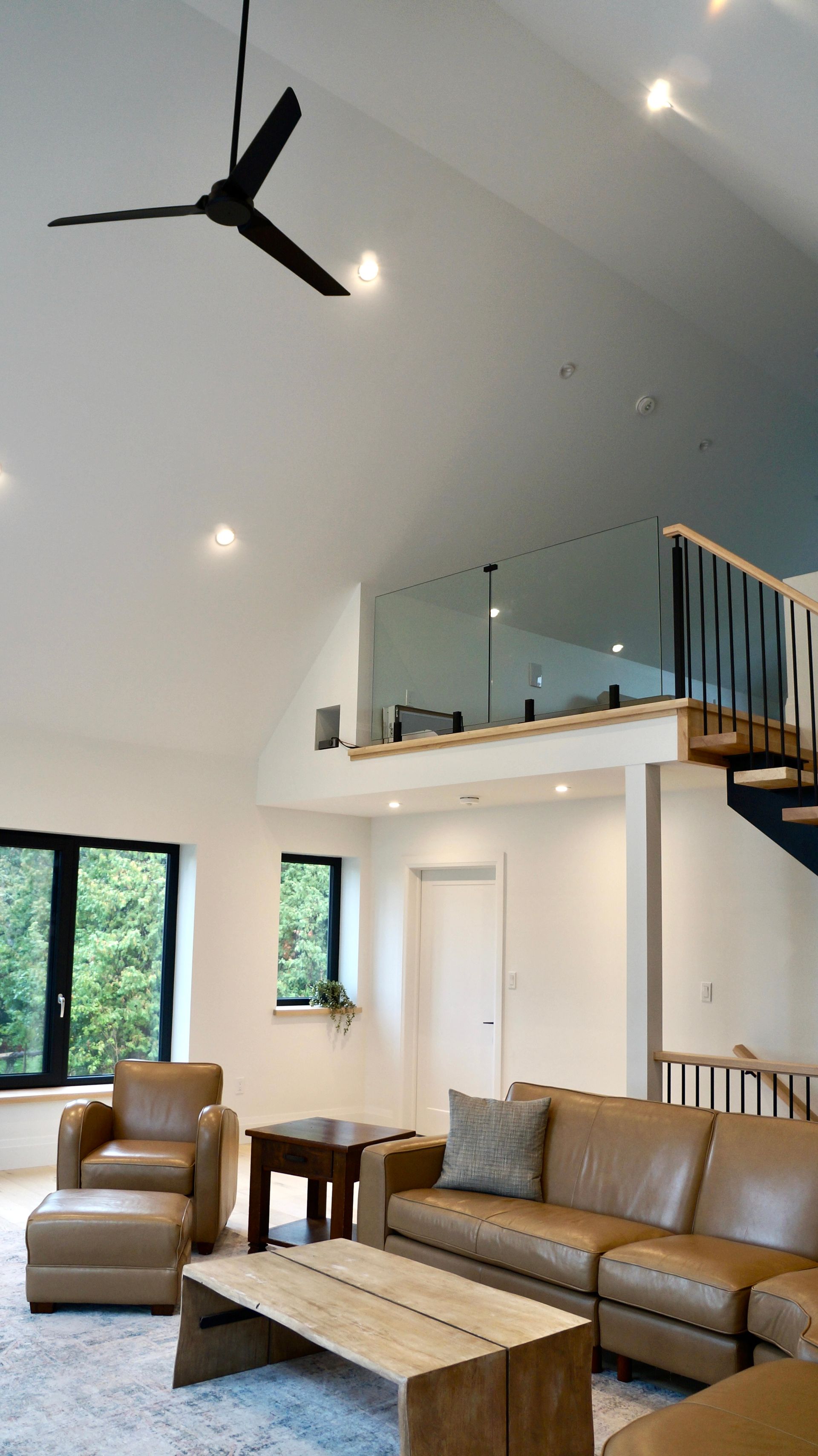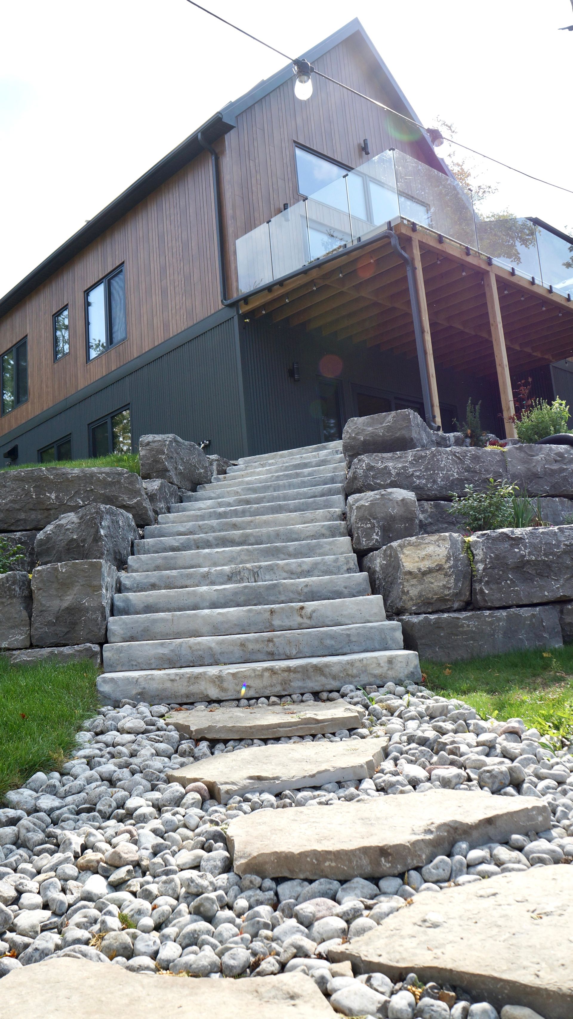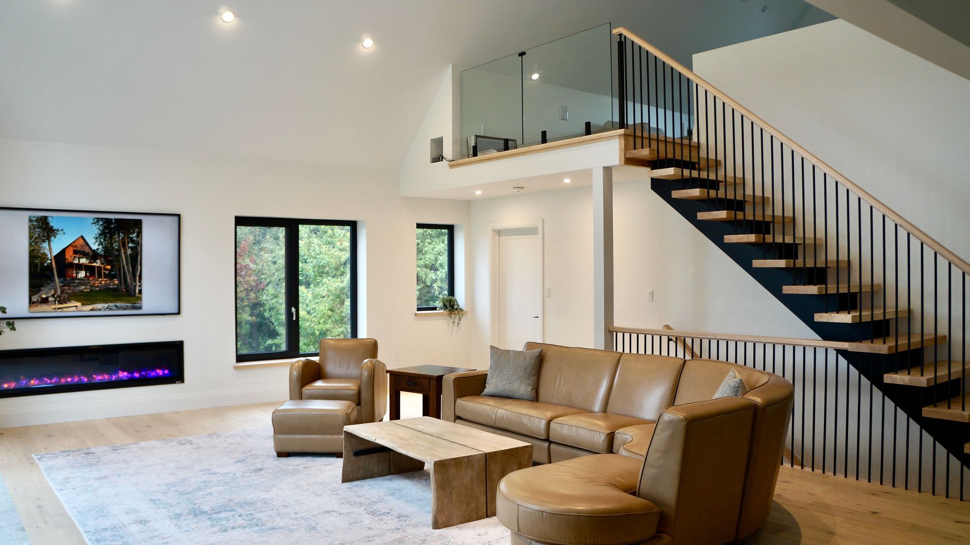 A dying maple tree was milled into slabs for the open-riser stair treads, set into a steel-string stringer. A one-of-a-kind feature with a real story behind it.